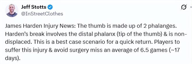 医学专家Stotts表示:拇指由两节指骨组成。哈登骨折的是远端指骨(拇指指尖),且为未移位骨折。对快速复出而言,这已是最好的情况。遭遇此类伤病且无需手术的球员,平均缺席6.5场比赛(约17天)。