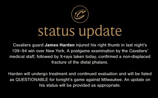 哈登第一时间并未直接被排除参加今天的比赛,这意味着此次伤情大概率不需要长期休战。不过最终仍需根据治疗方案确定,骑士方面称会适时更新这位明星后卫的状态。