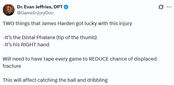 医学专家Jeffries表示:哈登这次受伤有两点比较幸运:1.只是拇指末端的远端指骨受伤,2.受伤的是右手(非投篮手)。后续每场比赛都需要缠胶布固定,降低发生移位骨折的风险。这会影响他接球和运球。